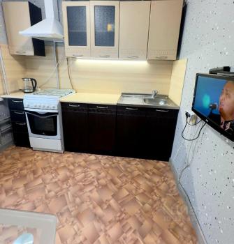 В квартире есть, сковородки, кастрюли, посуда первой необходимости. Вытяжка на кухне. В спальне два больших шкафа, диван 2-х спальный и кровать односпальная.