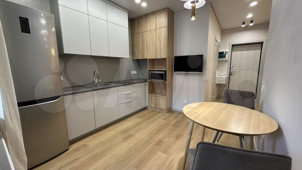 Кухня совмещена с гостиной, установлен смарт ТВ-42 и раскладной диван.