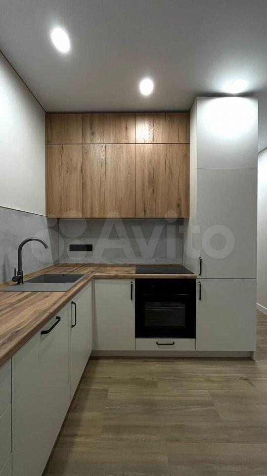 В квартире присутствует кухонный гарнитур, стол, стулья, варочная панель, духовой шкаф, вытяжка, холодильник, чайник, микроволновая печь, стиральная машинка.