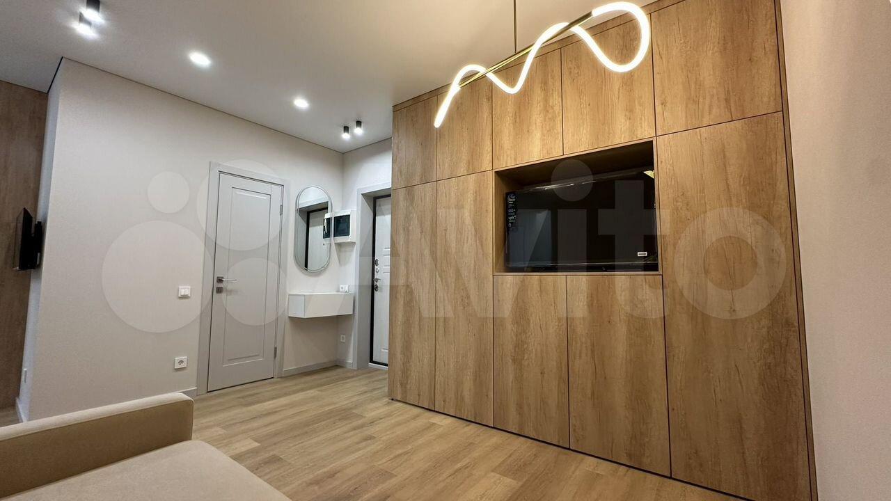Кухня совмещена с гостиной, установлен смарт ТВ-42 и раскладной диван.
