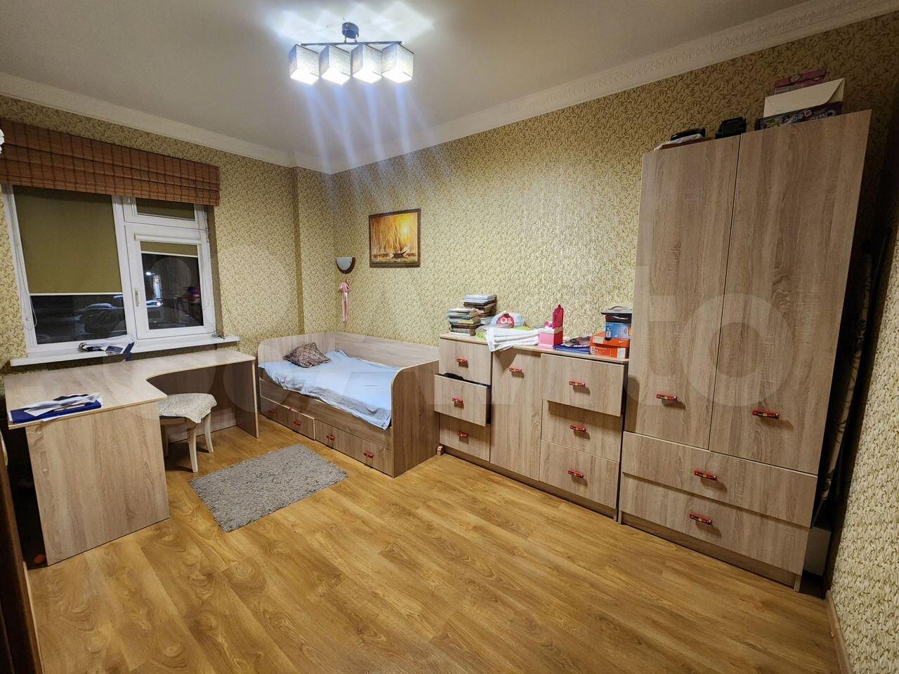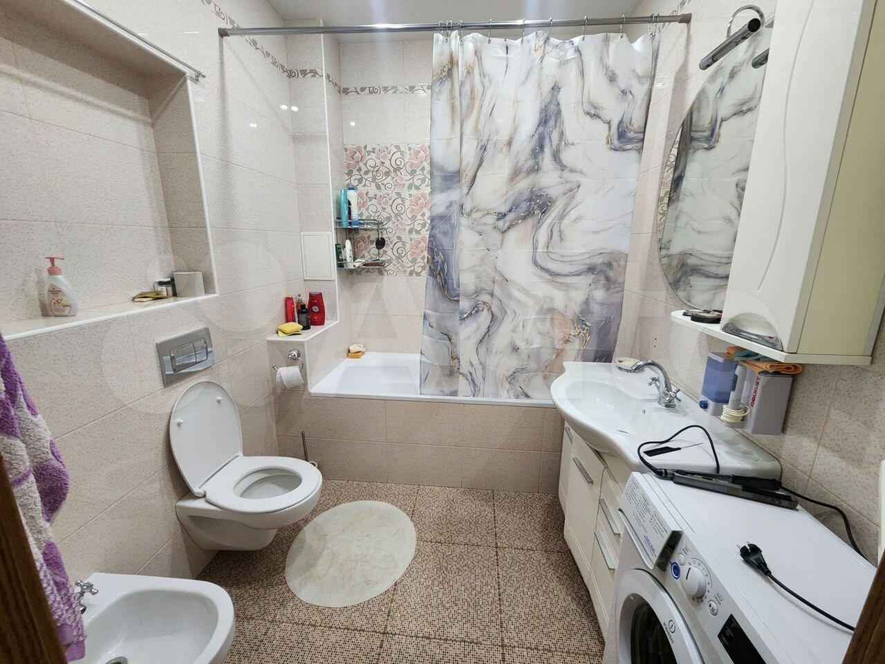 В раздельных спальнях две большие кровати, есть рабочая зона и вместительные шкафы с вешалками. Ванная комната совмещенная, оборудована современной душевой кабиной, гигиеническим душем и стиральной машиной. Из окон открывается вид на двор с детской площадкой.
