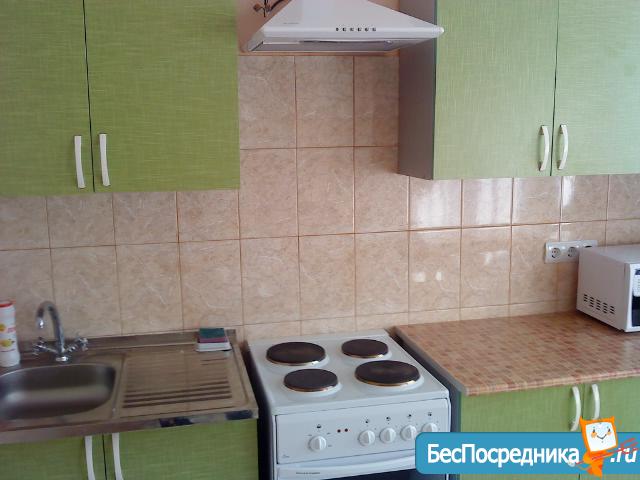 В квартире есть, сковородки, кастрюли, посуда первой необходимости. Вытяжка на кухне. В спальне два больших шкафа, диван 2-х спальный и кровать односпальная.