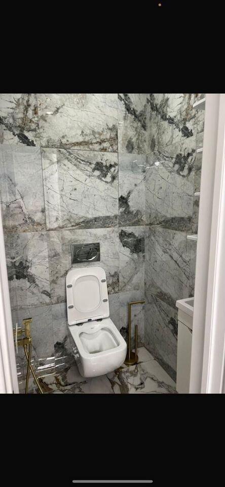 - в большом санузле: шкаф для гигиенических предметов, зеркало, раковина, биде, унитаз, ванна;