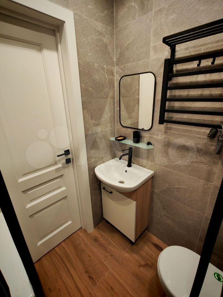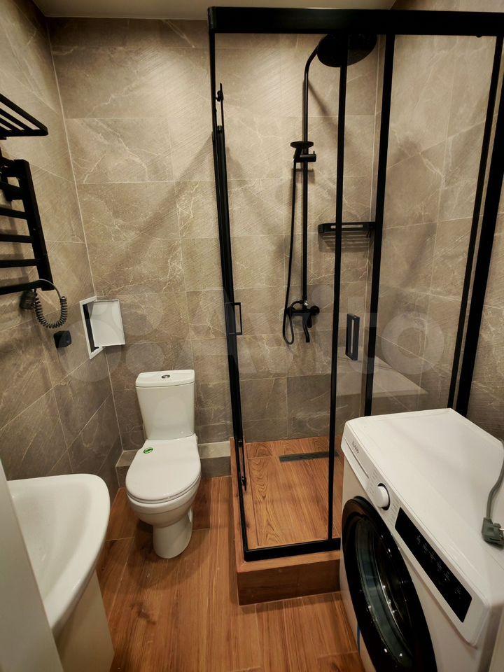 Санузел совмещенный, оформлен в современном стиле с качественной отделкой, есть полотенцесушитель, стиральная машина. В прихожей предусмотрена гардеробная для удобного размещения одежды. Отпариватель для одежды остается, мощный пылесос тоже. Из окон открывается вид на город, добавляя ощущение простора и свободы.