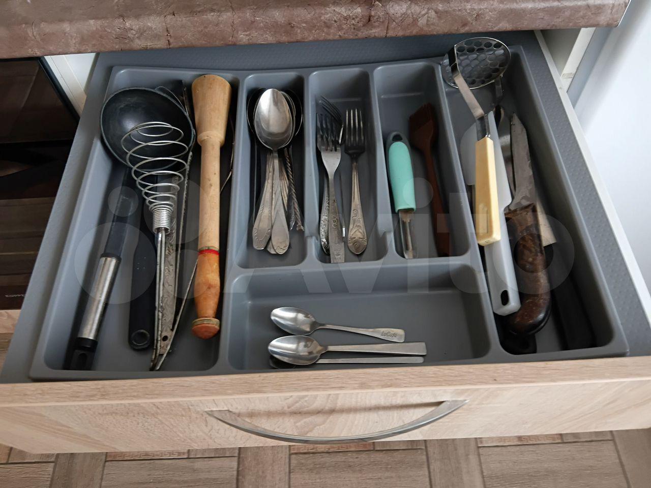 В куxнe-гoстиной: вcтрoеннaя кухня, cиcтема очистки воды, столовая группа, диван.