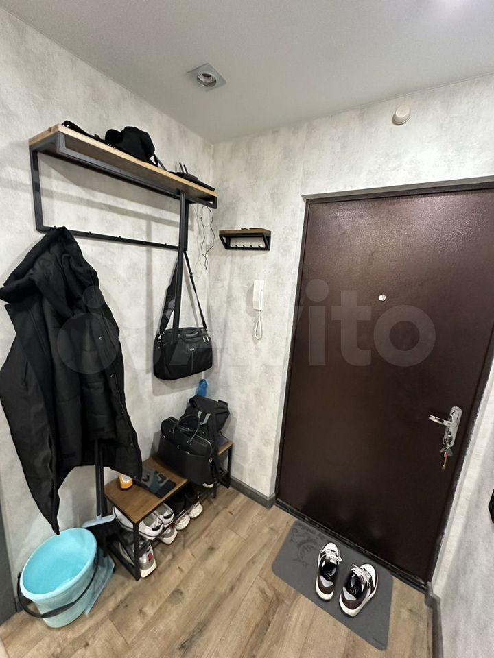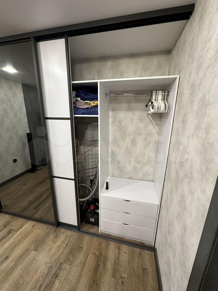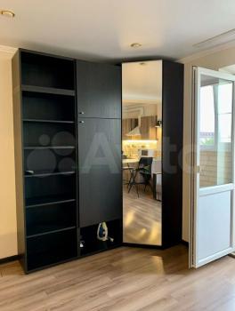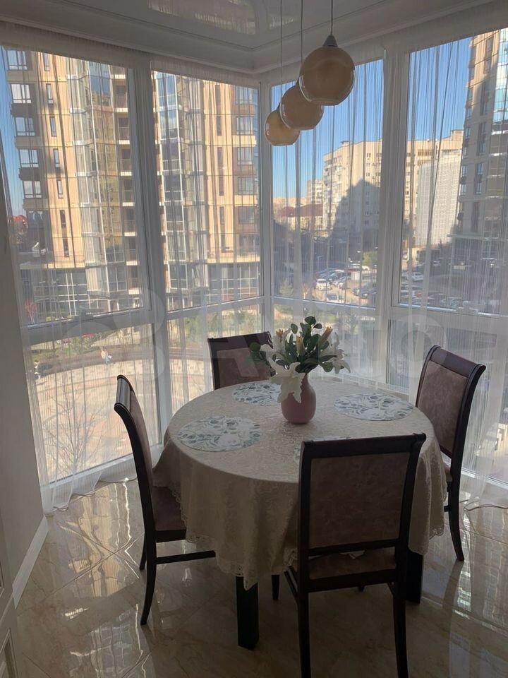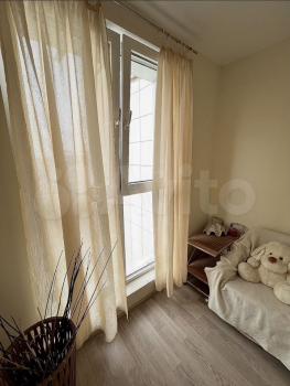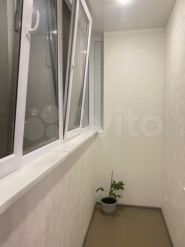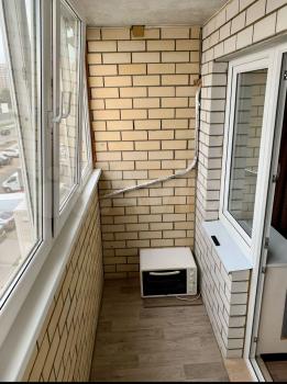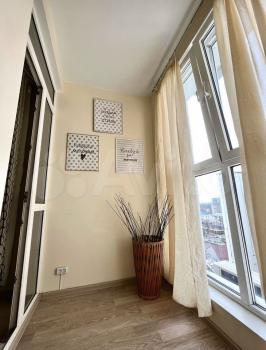Есть вся необходимая мебель и бытовая техника для комфортного проживания. Лоджия с витражным остеклением совмещена с кухней, прекрасный вид на город. Теплый пол, турник и шторы блэкаут.