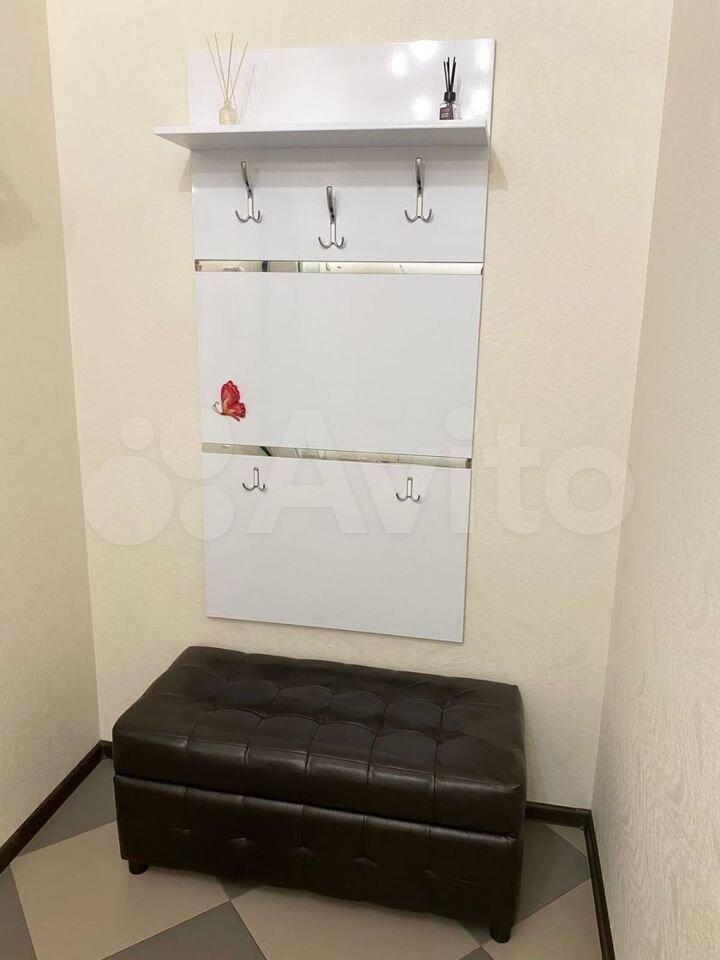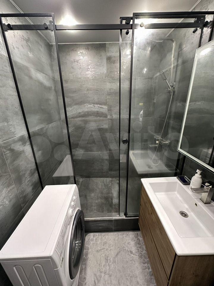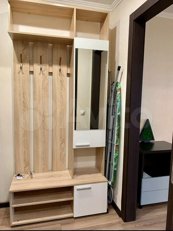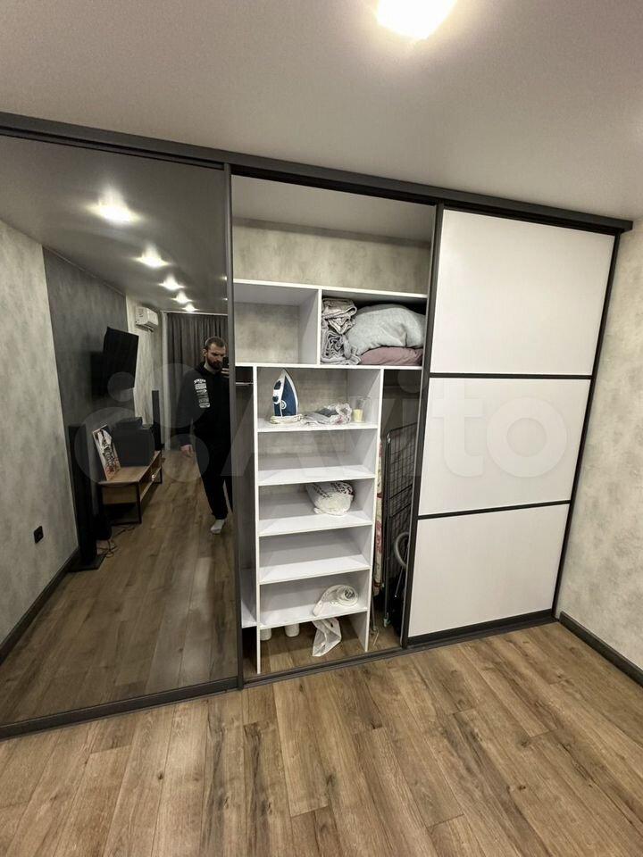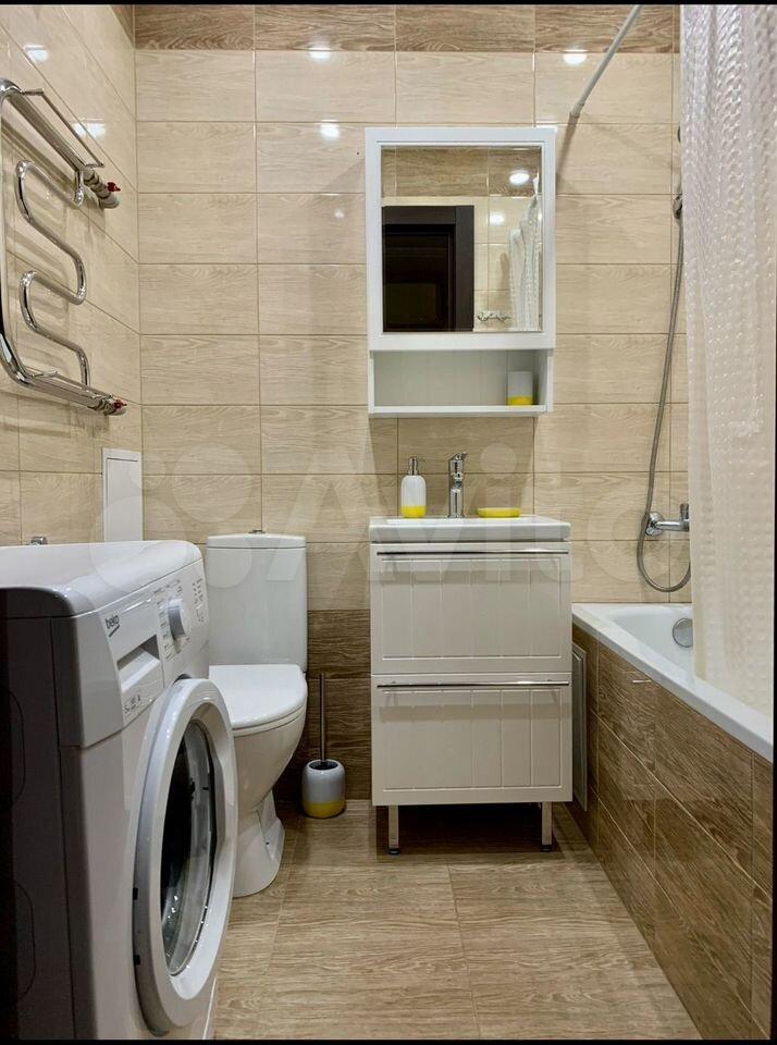 Есть вся необходимая мебель и бытовая техника для комфортного проживания. Лоджия с витражным остеклением совмещена с кухней, прекрасный вид на город. Теплый пол, турник и шторы блэкаут.