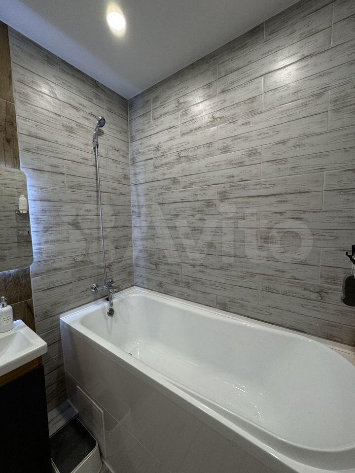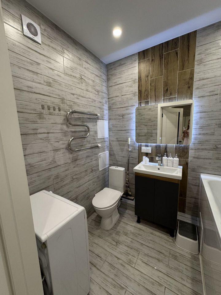 Кухня оснащена современной техникой, включая плиту и микроволновую печь. Санузел совмещённый, оформлен в светлых тонах и оборудован ванной и стиральной машиной.