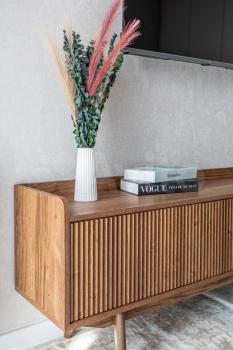 Жилая зона включает в себя уютную гостиную с диваном и телевизором, а также обеденную зону с круглым столом и стульями. В зале установлен удобный диван и шкаф.