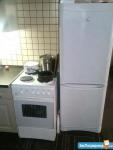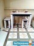 Кухня: кухонный гарнитур, посуда (Столовые приборы, кастрюли, сковородки, тарелки, электрический чайник, электрическая плита (гефест), стиральная машина (Индезит), холодильник, Кухонный стол со стульями.