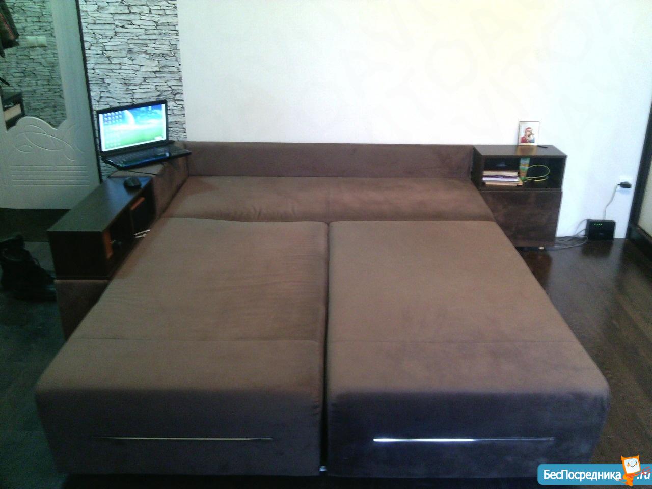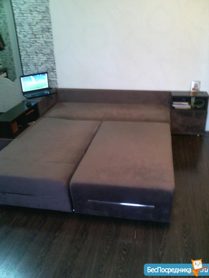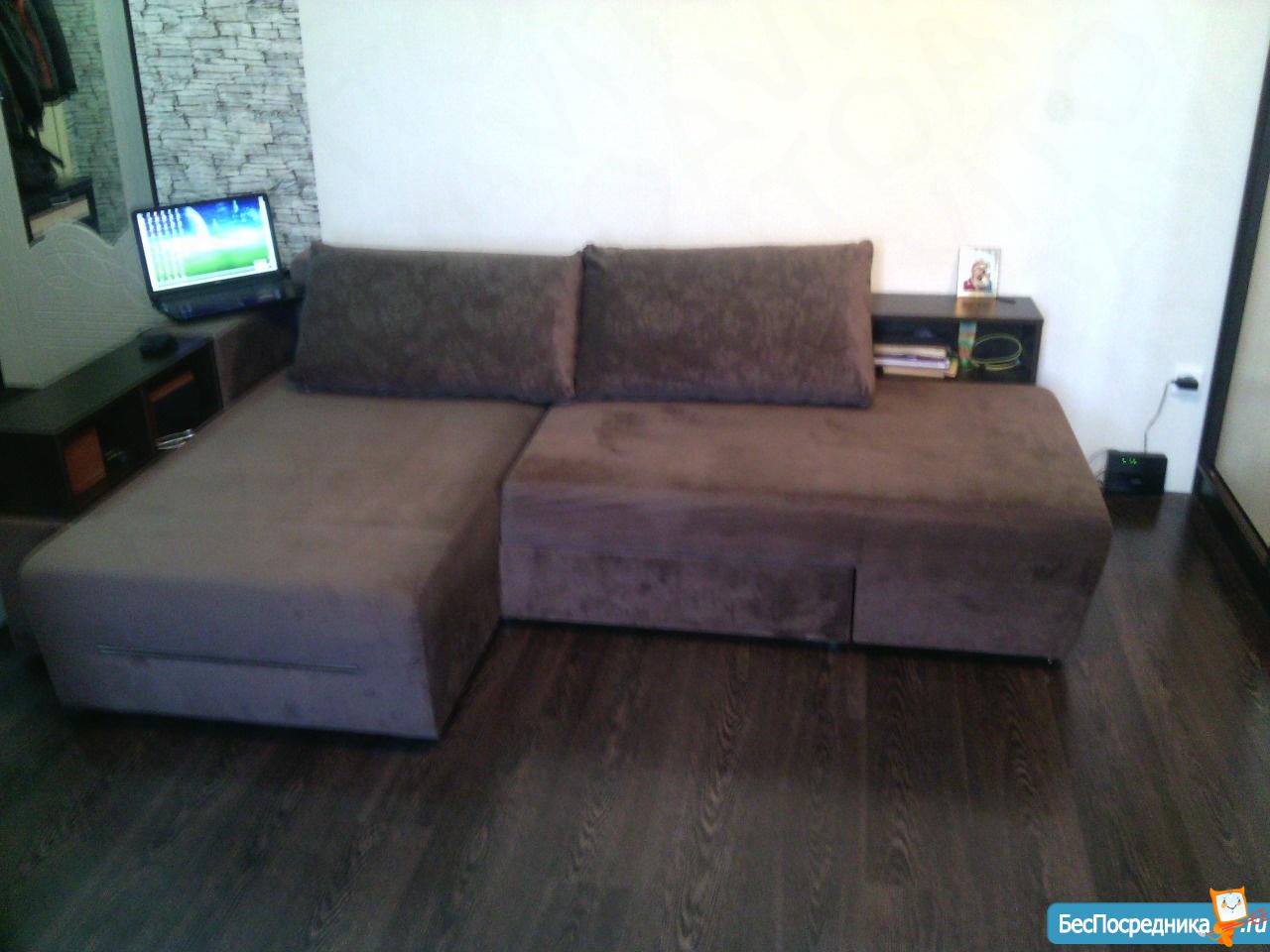 Комната: диван-кровать, журнальный столик, новый шкаф, утюг с гладильной доской.