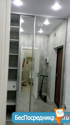 Есть все необходимое: сплит, кухонный гарнитур, стол с табуретками, зеркало, прихожая, диван, шкаф, холодильник, индукционная варочная панель, вытяжка.