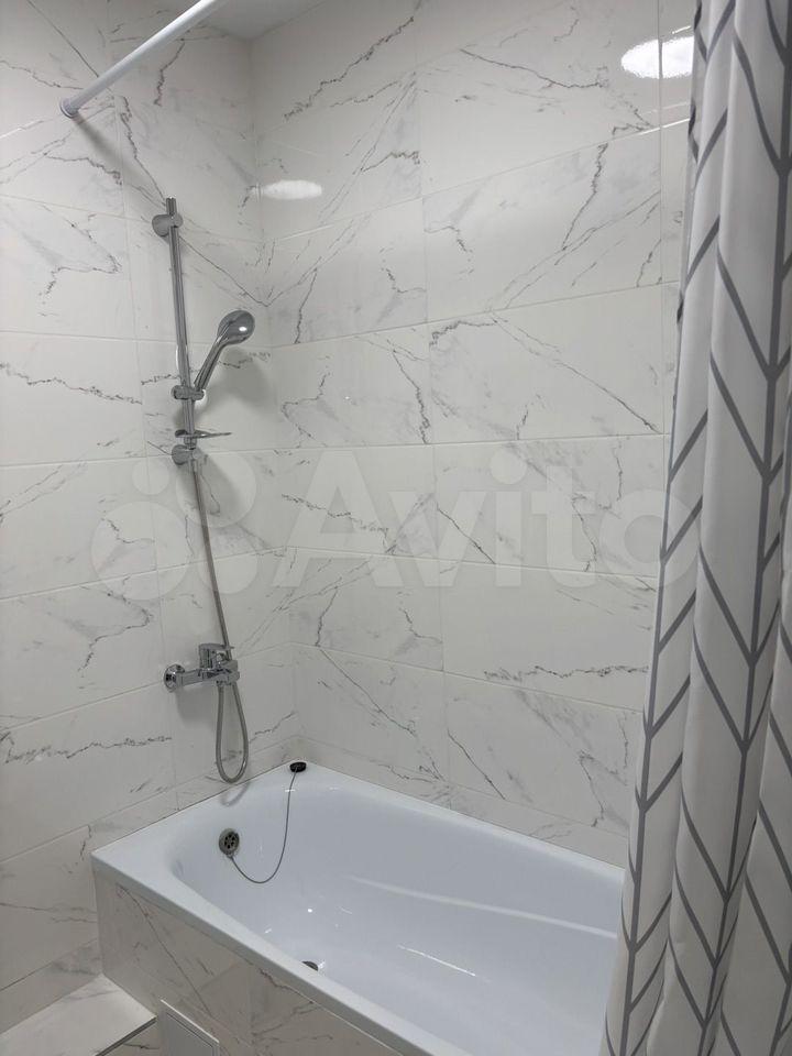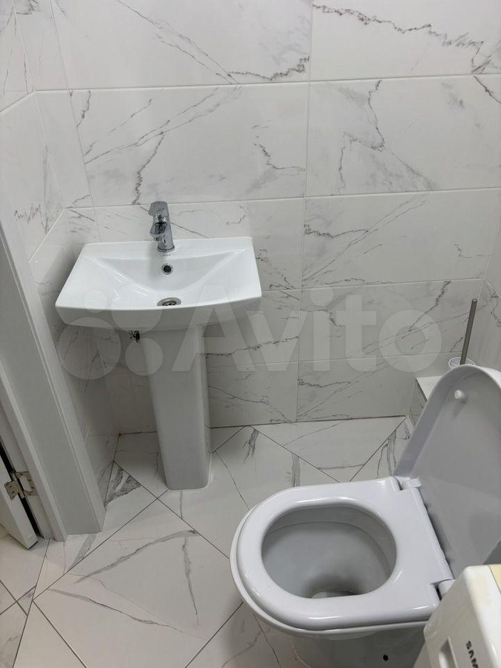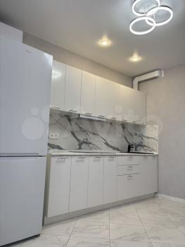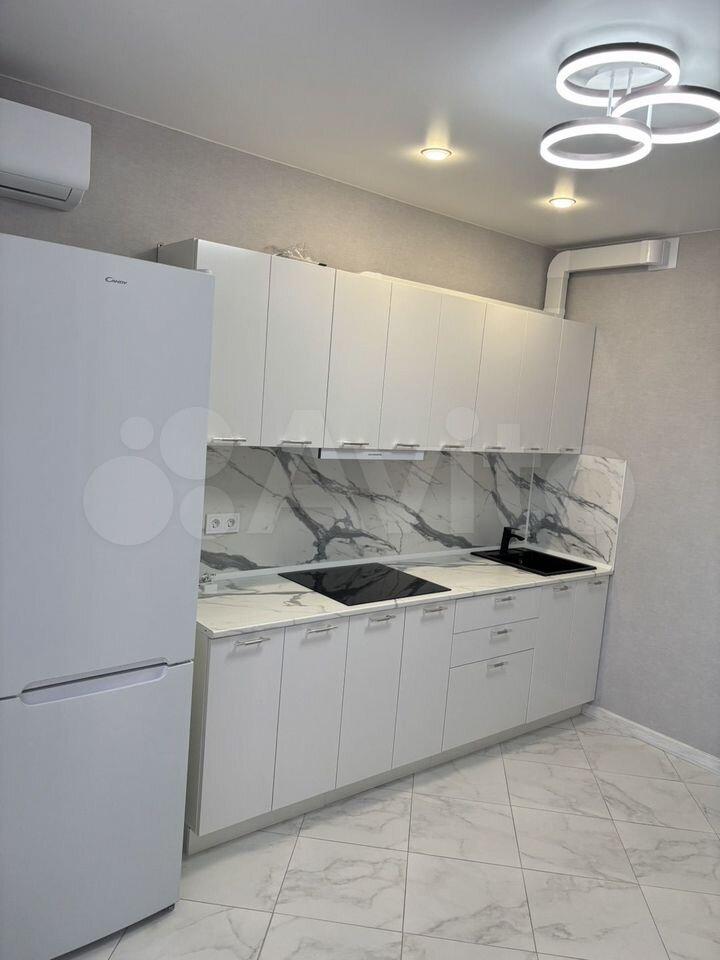Студия . Ещё никто не жил . Есть холодильник , стиральная машина, эл плита (4 конфорки), эл чайник , шкаф, тв, диван, кухня . Санузел и пол - керамогранит , натяжные потолки .