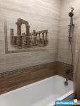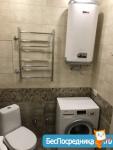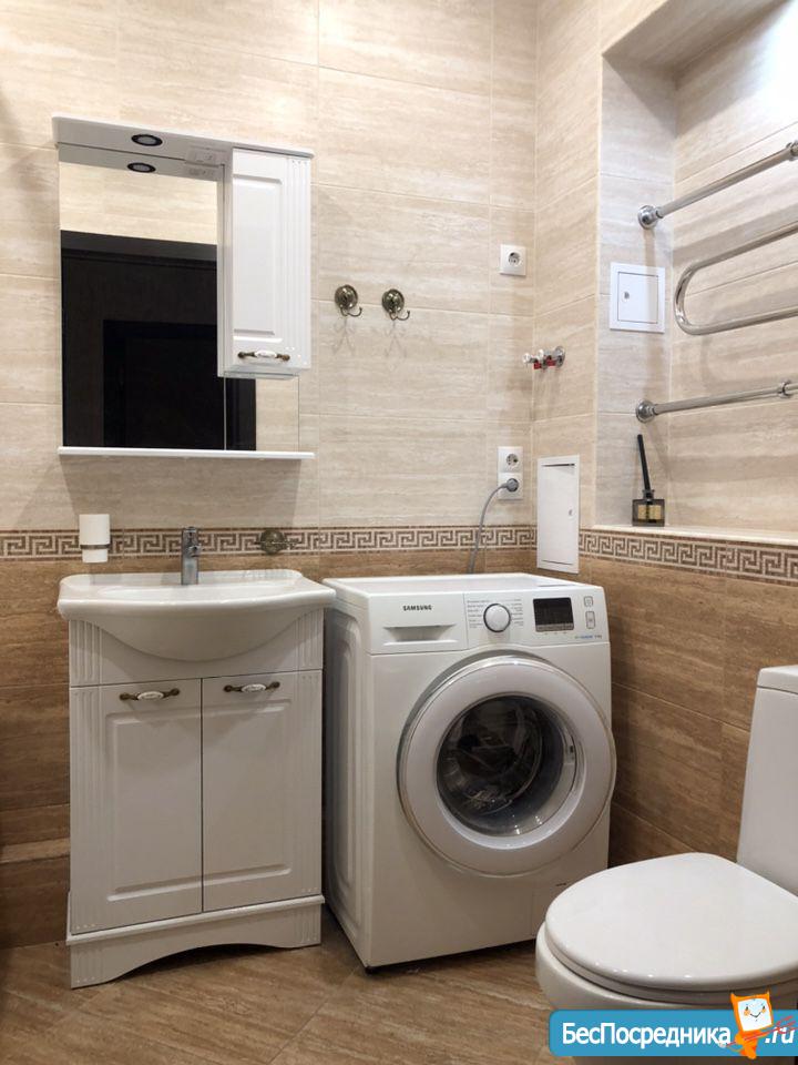 Санузел: ванна, стиральная машина, сушилка для полотенец, раковина, зеркало, унитаз.