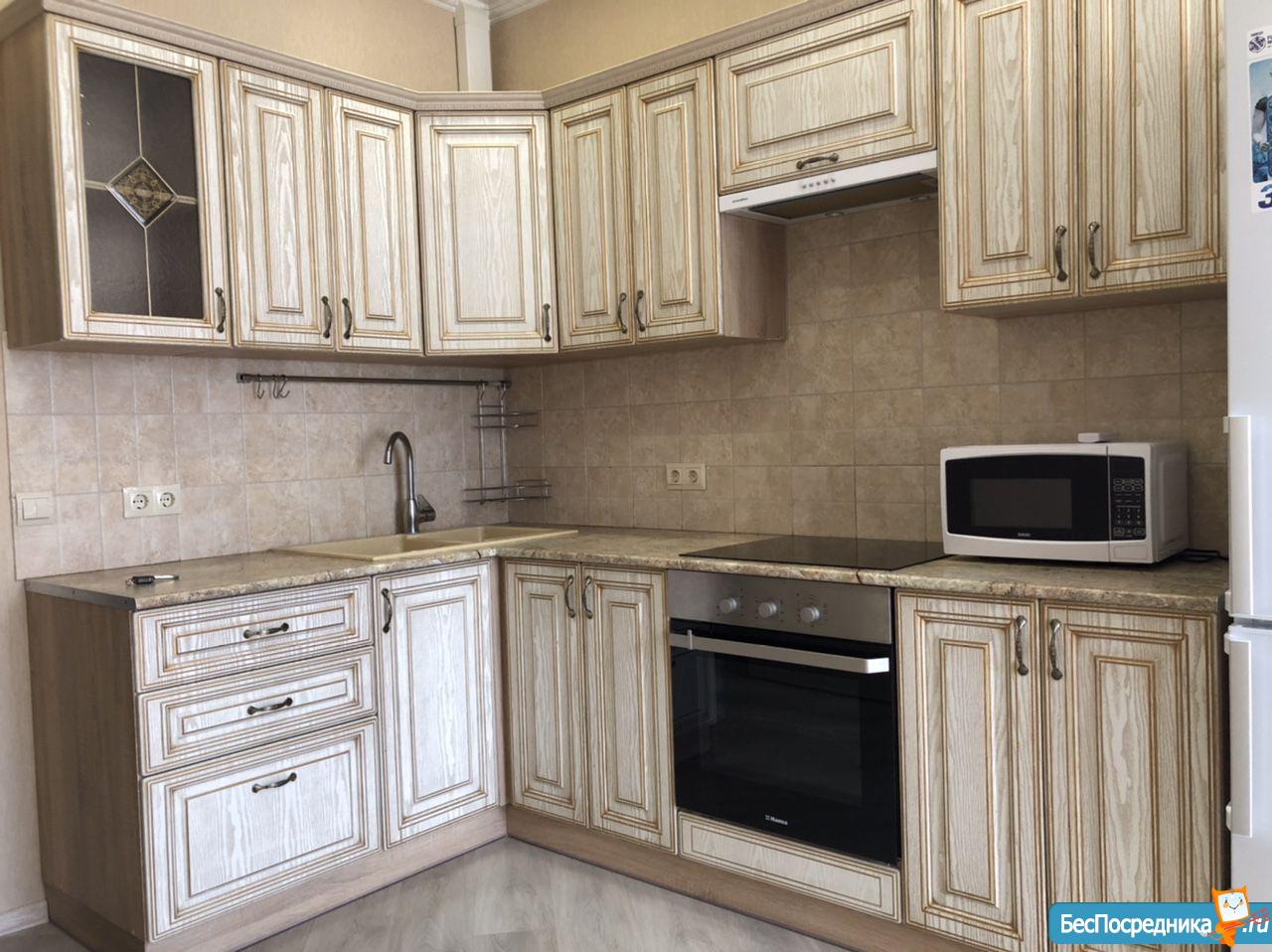 Кухня: кухонная плита с духовкой, холодильник, СВЧ-печь, электрочайник, встроенная кухня, стол, стулья.