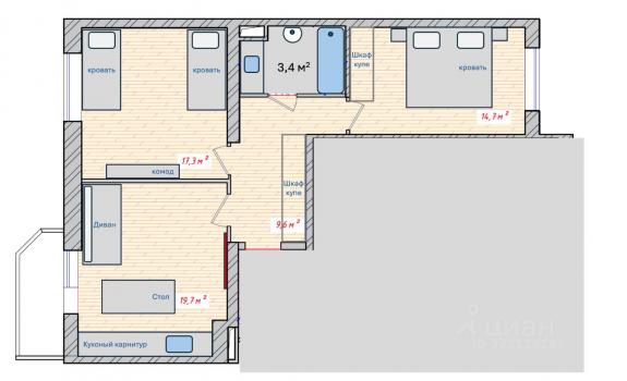 • Планировка: большая кухня-гостиная 19.5 кв.м и две изолированные спальни (14.7 и 17.3 кв.м).