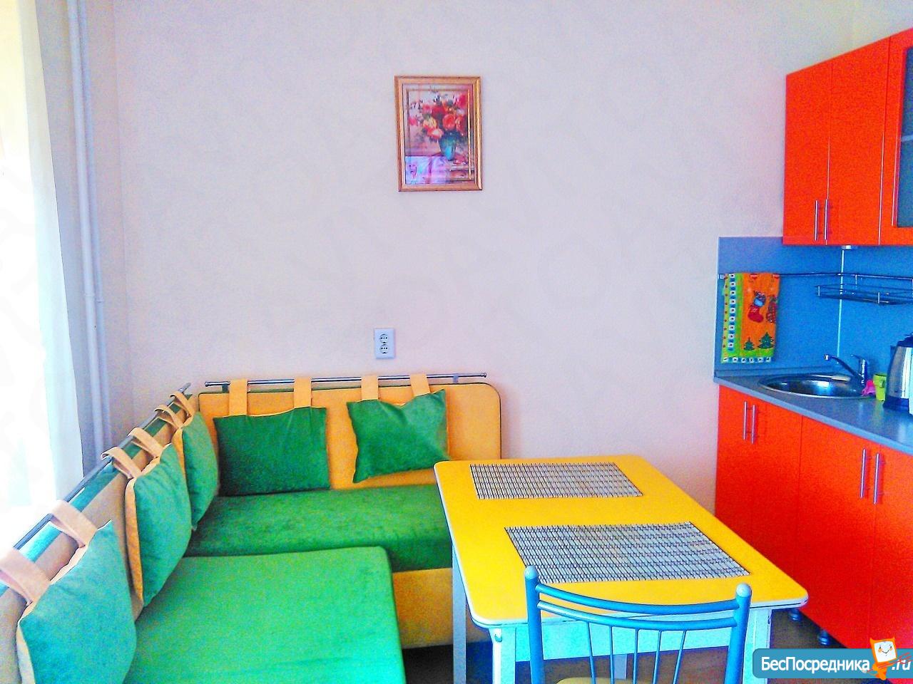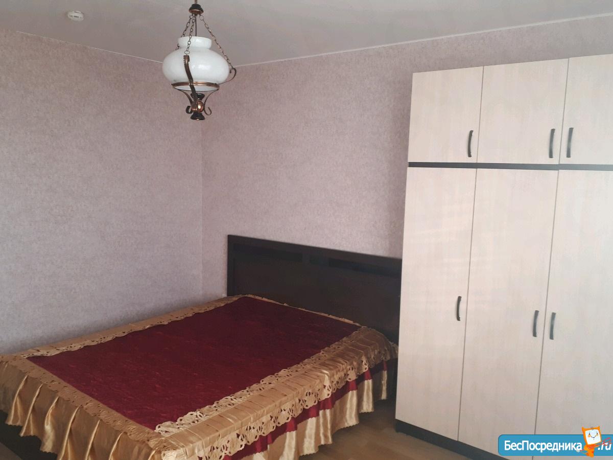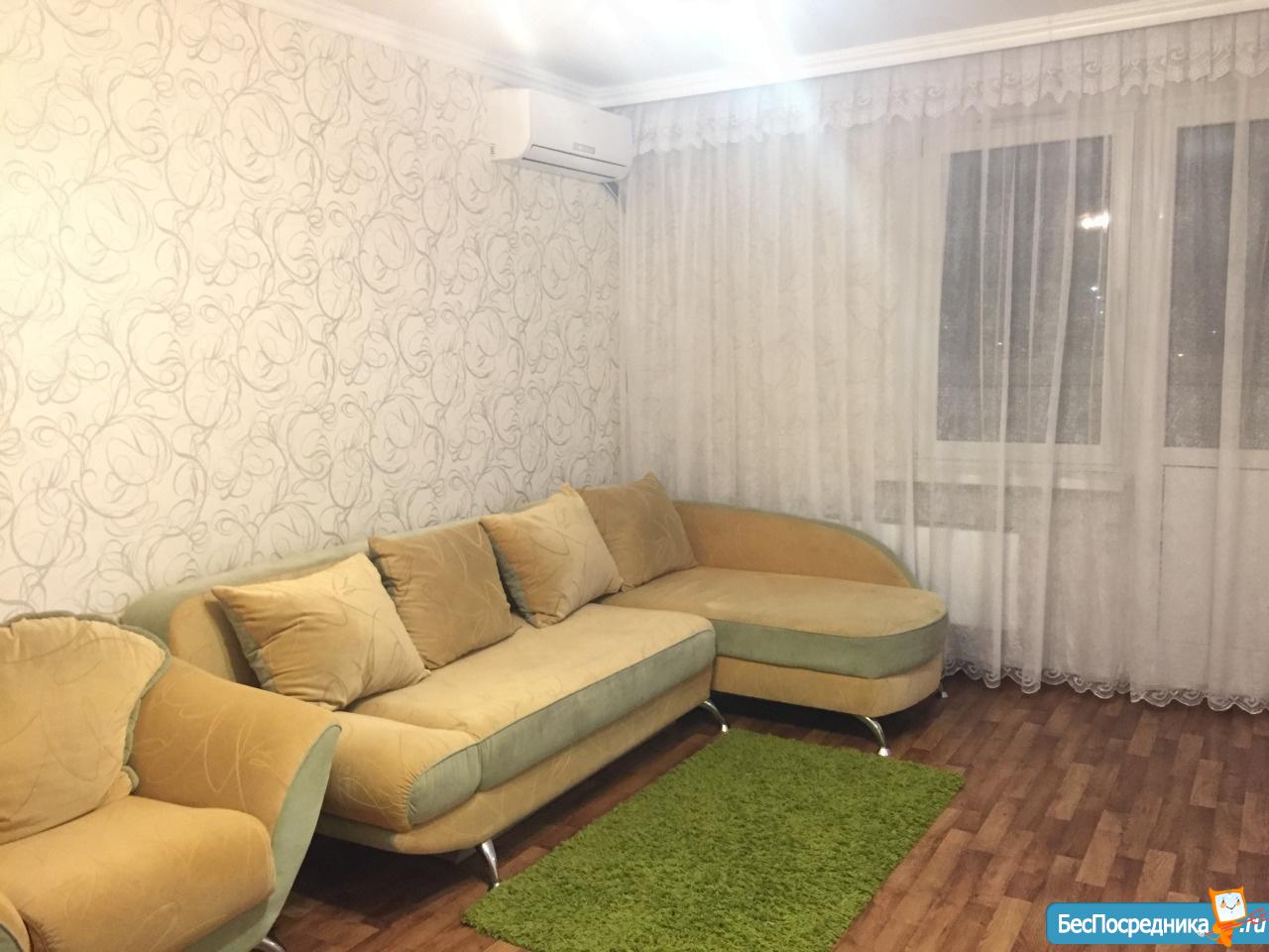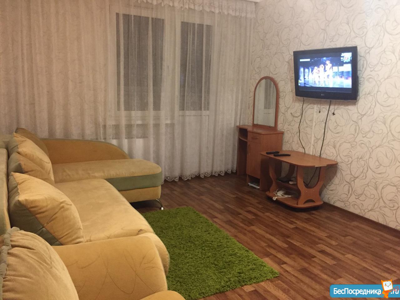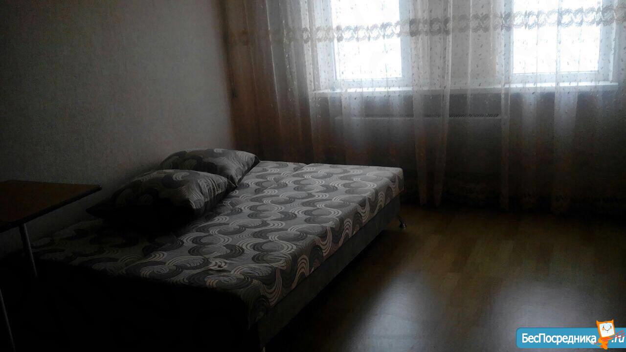 1 комнатная квартира 42 кв. м, кухня 10 кв. м, комната 25 кв. м. Большой балкон (на 2-е комнаты - 2-а выхода) - застеклен. В квартире сделан ремонт. Имеется диван, кровать, телевизор, сплит-система, шкаф, стиральная машинка, холодильник, кухня полностью оборудована встроенной техникой, туалетный столик, журнальный столик. Вся мебель и техника новая! Спутниковое телевидение, скоростной интернет. Продуктовый магазин в доме на первом этаже, остановка транспорта возле дома. Рядом поликлиника, Детский садик, Школа!