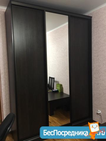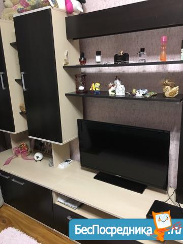 Комната: диван-кровать (в разложенном состоянии большая двуспальная кровать), шкаф-купе (сделан под заказ), стол трансформер (в сложенном - состоянии журнальный столик, в разложенном - большой обеденный), стенка для гостиной, компьютерный стол со стеллажом, телевизор, тв-приставка (есть WI-FI).