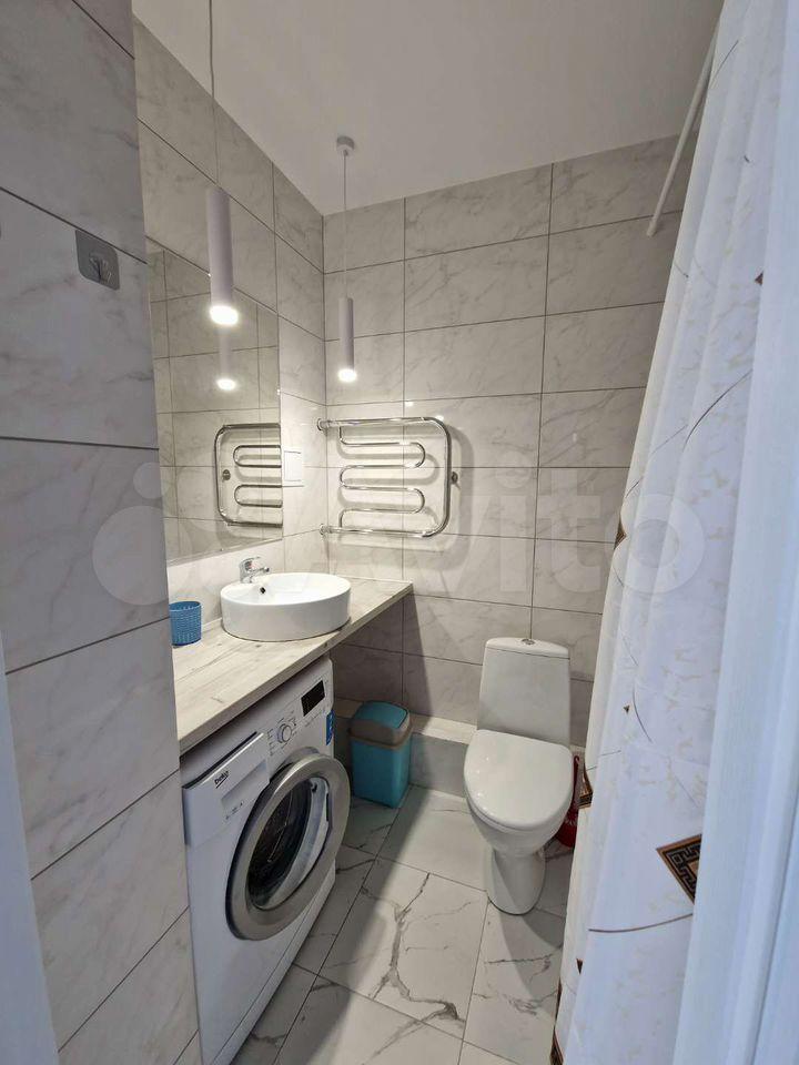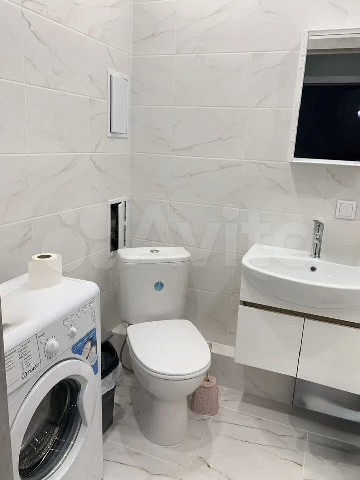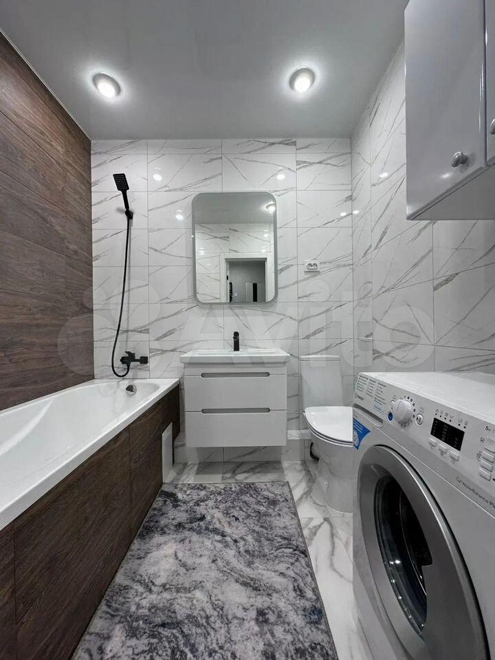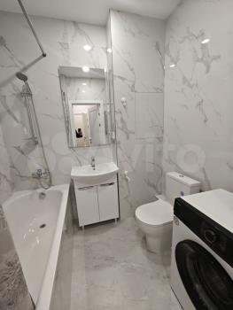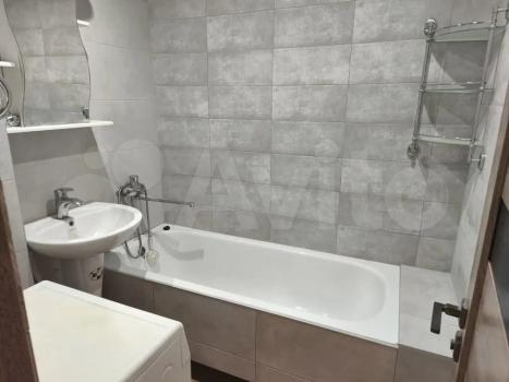 Санузел совмещенный, выполнен в светлых тонах, оснащен новой сантехникой и стиральной машиной. Из окон открывается приятный вид на город.