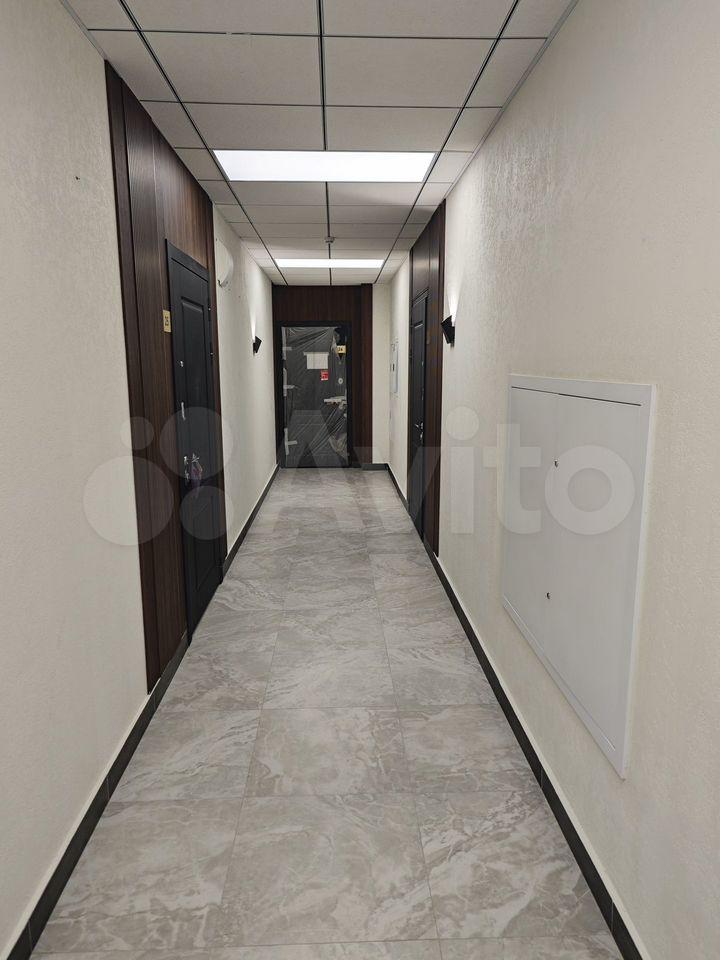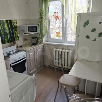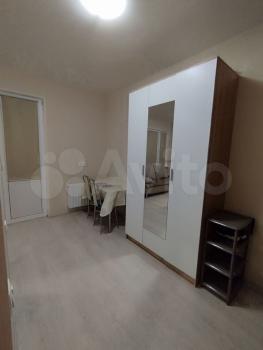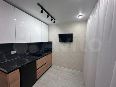 Общая площадь квартиры — 33 кв.м., кухня — 10 кв.м. Просторная комната оборудована шкафами и диваном, что обеспечивает комфортное проживание. В кухне установлена современная мебель и холодильник.