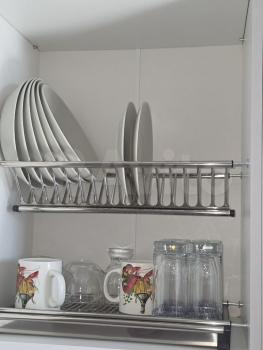 - Полный набор посуды: тарелки, кружки, столовые приборы, кастрюли, сковорода и т.д.