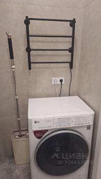 Ванная комната оборудована стиральной машиной и современной сантехникой.