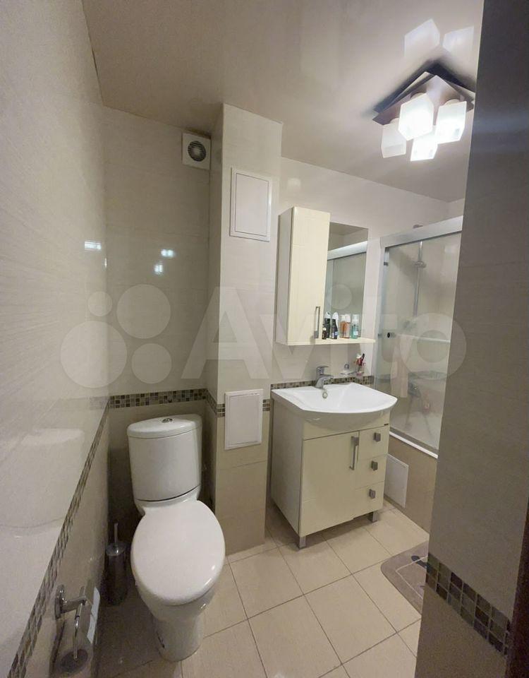 Санузел совмещённый, оформлен в светлых тонах с качественной сантехникой. Лоджия застеклена, что позволяет использовать её как дополнительное пространство для отдыха.