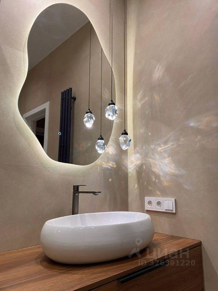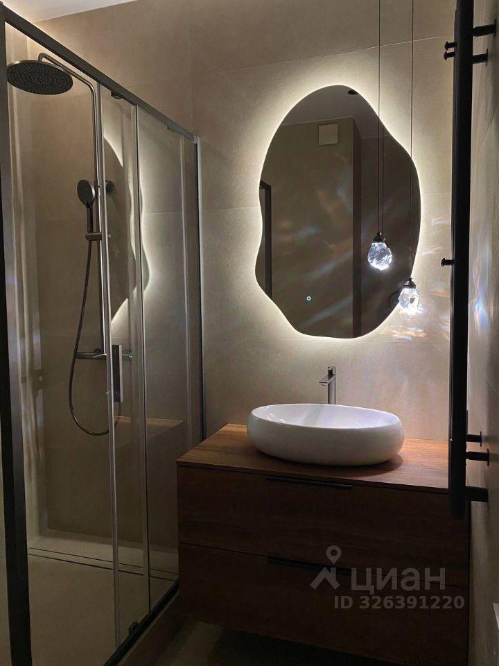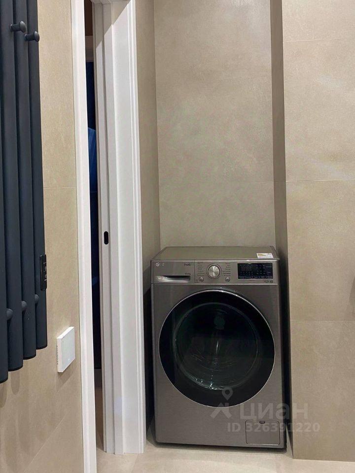 В санузле стиральная машина с функцией сушки, зеркало с подсветкой.