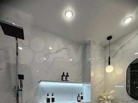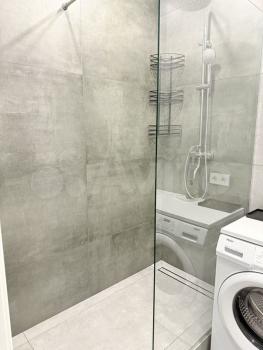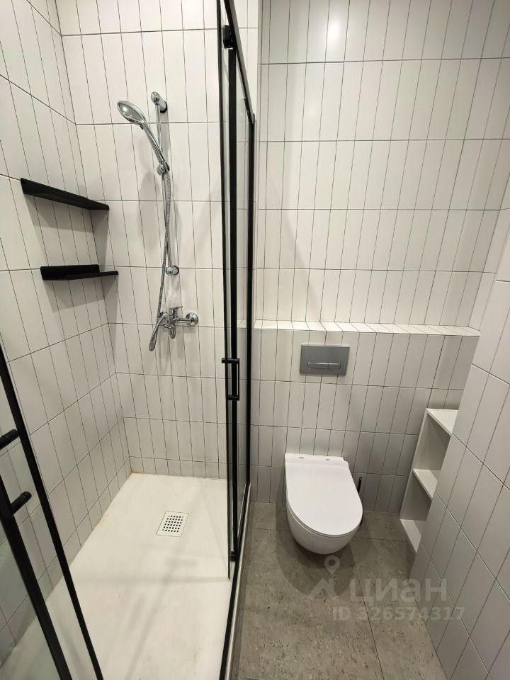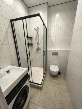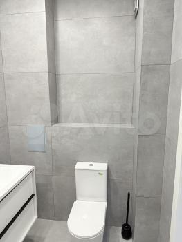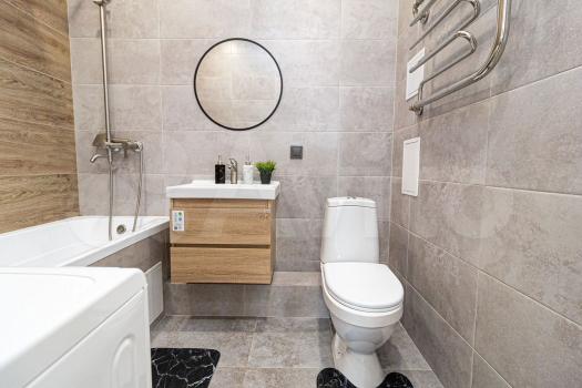Санузел совмещённый, оформлен в светлых тонах с качественной сантехникой. Лоджия застеклена, что позволяет использовать её как дополнительное пространство для отдыха.
