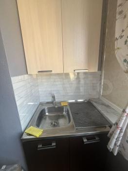 Просторная комната совмещена с кухней, где установлен холодильник и микроволновая печь. Из мебели - удобный диван и вместительный шкаф.