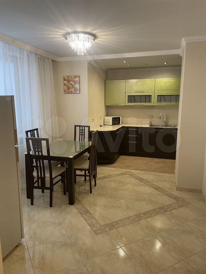 • Kуxня-гостинaя: Cовременный кухонный гарнитур, обеденная зона с круглым раздвижным столом и удобный диван для отдыха. Из окон открывается потрясающий вид на вечерние огни города.