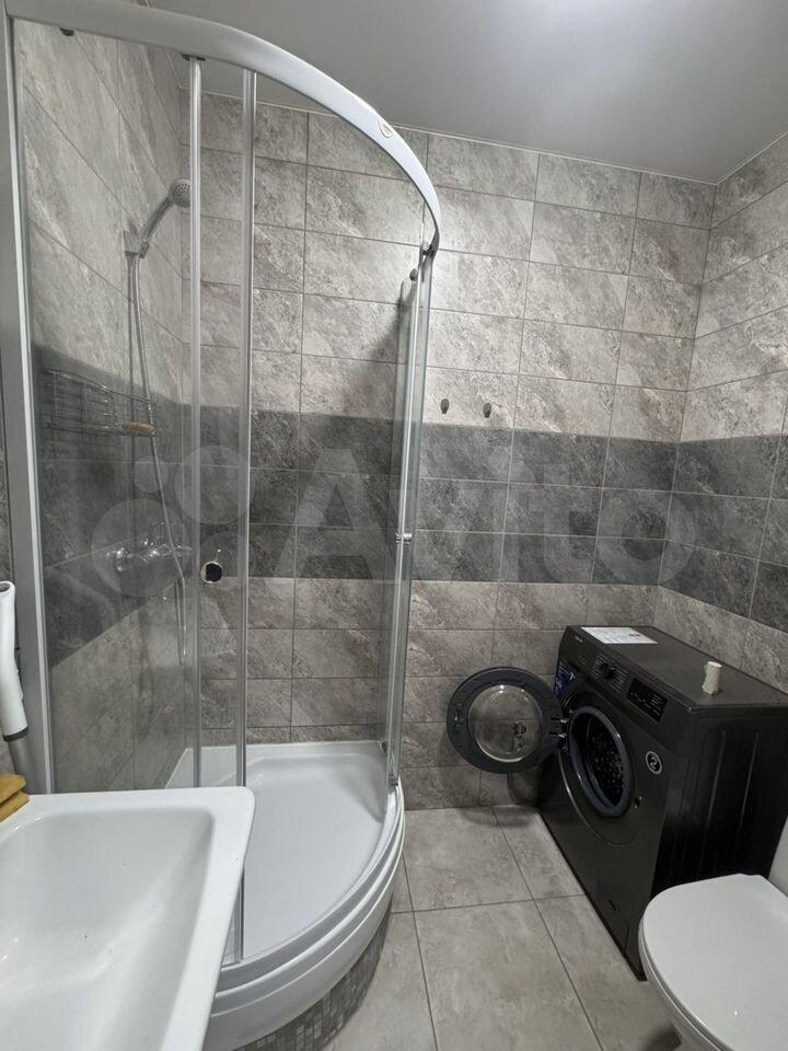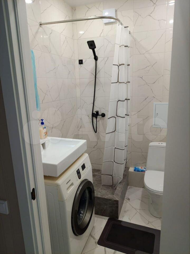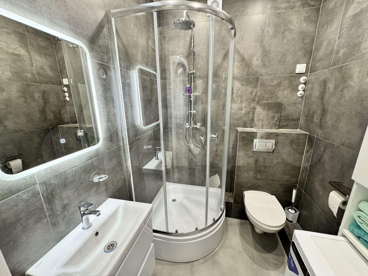 душевая кабинка, стиральная машина с сушкой, зеркало с подсветкой