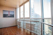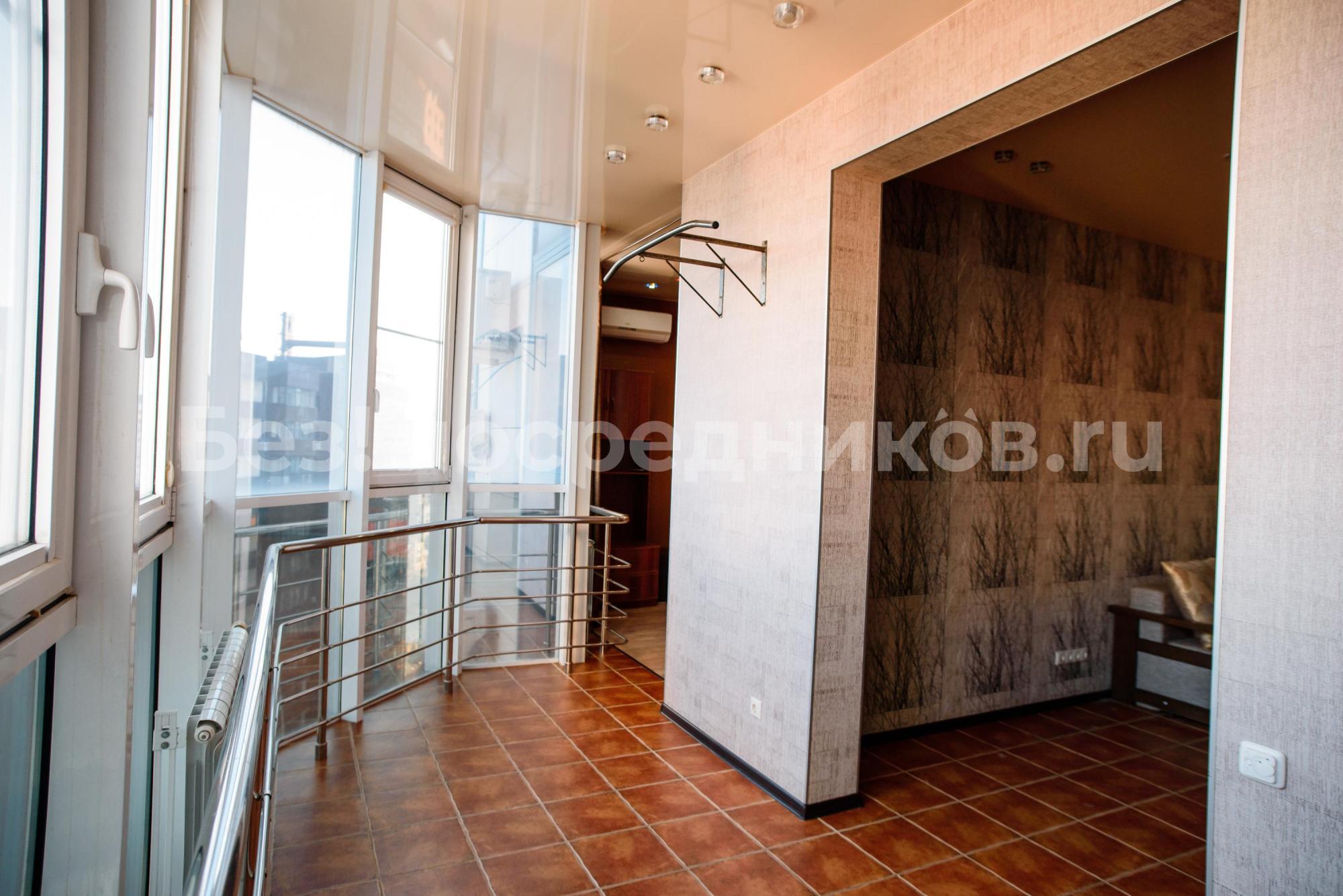 Есть вся необходимая мебель и бытовая техника для комфортного проживания. Лоджия с витражным остеклением совмещена с кухней, прекрасный вид на город. Теплый пол, турник и шторы блэкаут.